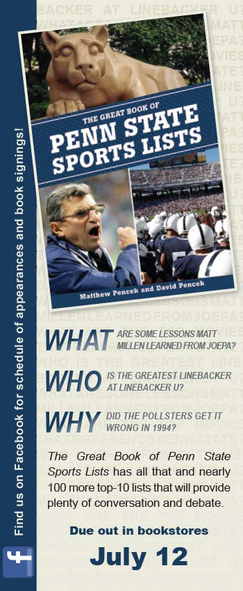 Bookmark promoting "The Great Book of Penn State Sports Lists" by authors Matthew Pencek and David Pencek.